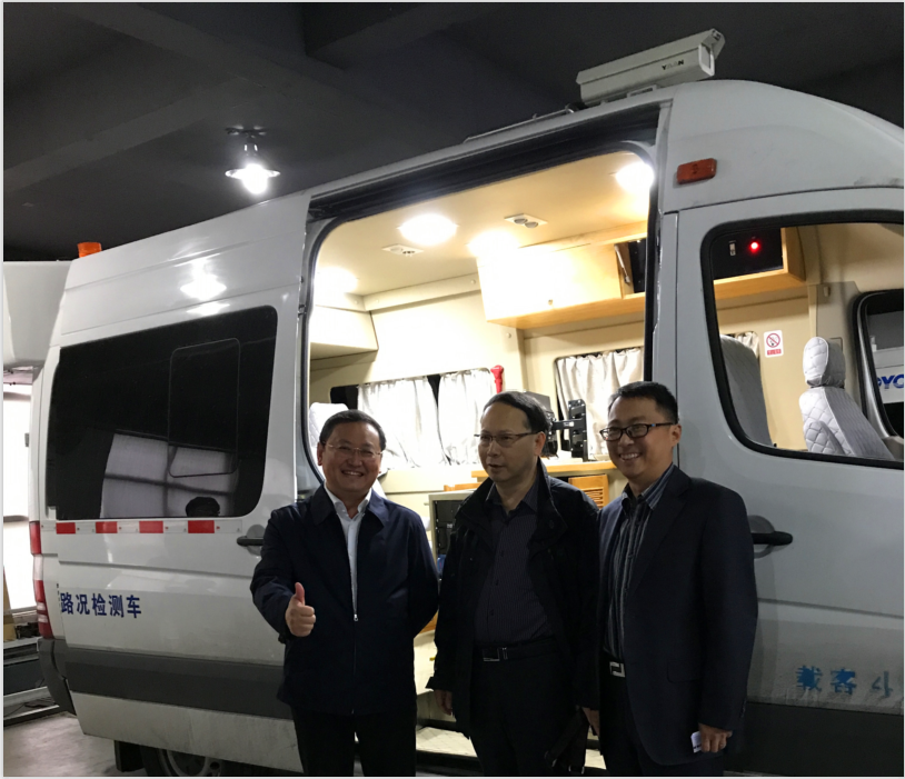 隨后,余國珊會長一行來到武大卓越科技裝備生產(chǎn)車間,饒有興致地參觀了智能道路檢測系統(tǒng)、激光動態(tài)彎沉測量系統(tǒng)裝備,并詢問系統(tǒng)功能及工作原理。下圖為余國珊會長(圖左二)一行與曹民董事長(圖左三)在智能道路檢測系統(tǒng)前的合影留念。?