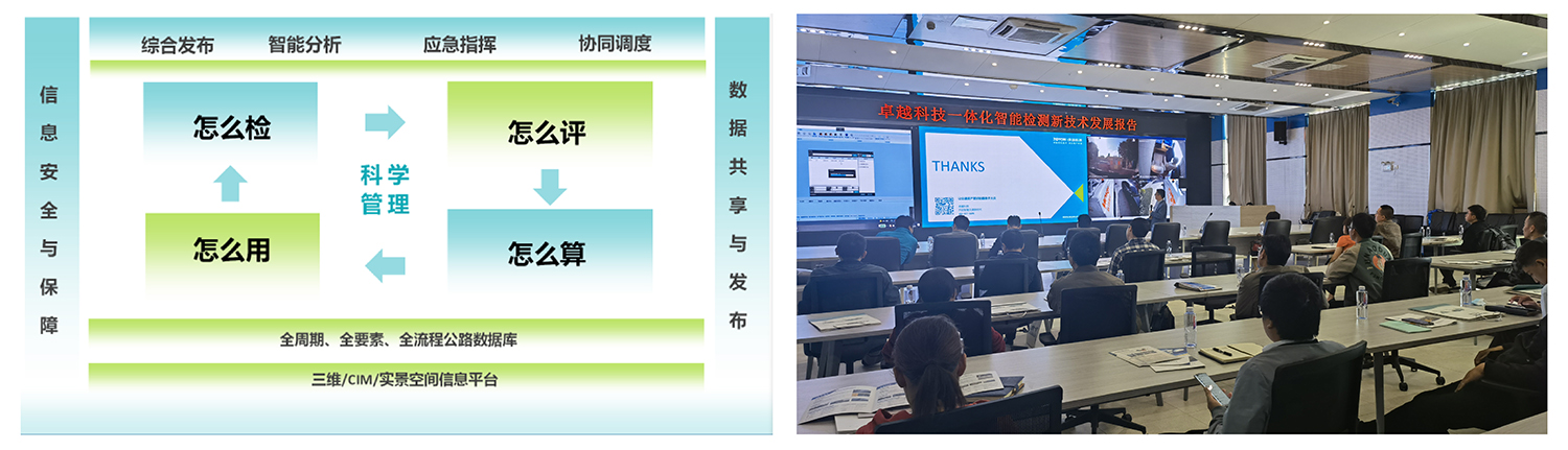卓越科技董事長曹民在會(huì)上詳細(xì)介紹了以三維、CIM、實(shí)景空間信息為平臺(tái)的智能檢測新技術(shù),及全周期、全要素、全流程的公路數(shù)據(jù)庫的一體化服務(wù),為客戶一站式解決怎么檢、怎么評(píng)、怎么算、怎么用;卓越科技一體化智能檢測新技術(shù)為客戶實(shí)現(xiàn)“檢”、“評(píng)”、“管”、“養(yǎng)”的信息化、智能化、科學(xué)化。