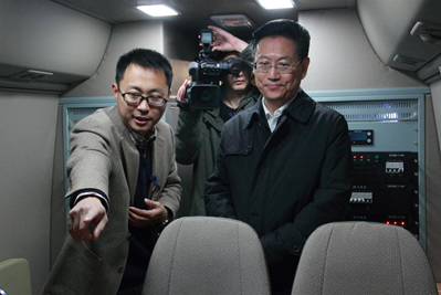 隨后楊松主席一行移步于生產(chǎn)車間。在曹民董事長的陪同下,楊松主席饒有興致地登上智能道路檢測系統(tǒng),了解和體驗這臺先進的道路檢測設(shè)備的各項功能。(卓越科技智能道路檢測系統(tǒng)在正常行駛情況下,能自動完成道路病害、道路沿線設(shè)施、路面形狀、車轍、平整度、道路幾何線形等數(shù)據(jù)的采集,可為道路預(yù)防性養(yǎng)護提供有力數(shù)據(jù)支撐)。