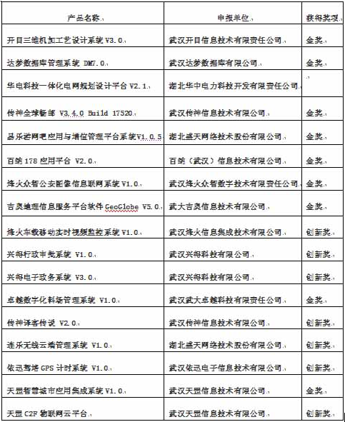 ?????本次湖北展團(tuán)著重突出了名企、名品對我省市中國軟件名城發(fā)展提升所起到的積極作用。在2014年北京軟博會(huì)金獎(jiǎng)和創(chuàng)新獎(jiǎng)評選過程中,湖北展團(tuán)共報(bào)送19件產(chǎn)品和信息化解決方案,最終有8項(xiàng)榮獲金獎(jiǎng),9項(xiàng)榮獲創(chuàng)新獎(jiǎng)。具體如下:?